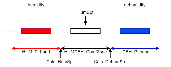 The next figure shows the calculated setpoints for the two controllers, and the adjusted comfort zone, which is symmetric around the HumSpt. The figure shows also the P-band for the humidify controller, totally shifted below its calculated setpoint, and the P-band for the dehumidify controller totally shifted above the calculated setpoint. For plant modes, 1 to 3 calculated comfort zone increases fourfold.