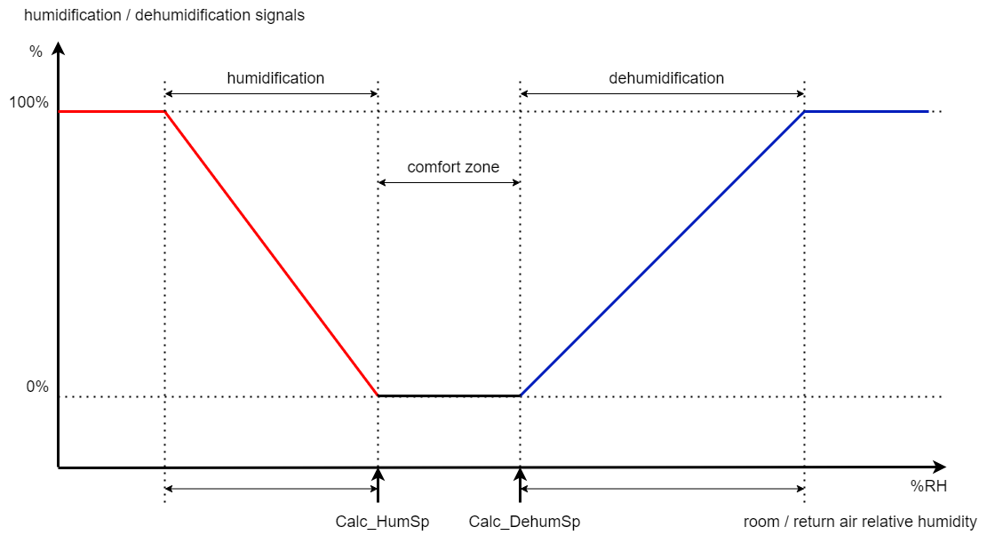 The humidity control module works in a typical sequencing application: humidifying and dehumidifying with an adjustable comfort zone between. In this case, the module uses two separate proportional controllers with internally calculated setpoints for humidification and dehumidification, depending on the value of the internal setpoint HumSpt and the adjusted comfort zone, defined by parameter HUMDEH_ComfZone.