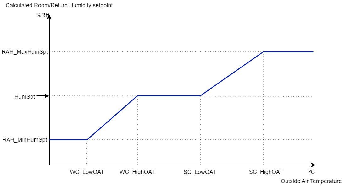 The calculated room RH setpoint is outside air compensated, defined by parameters WC_LowOAT, WC_HighOAT, SC_LowOAT, and SC_HighOAT, and limited between minimum and maximum values, defined by parameters RAH_MinHumSpt and RAH_MaxHumSpt, as shown in the next figure.