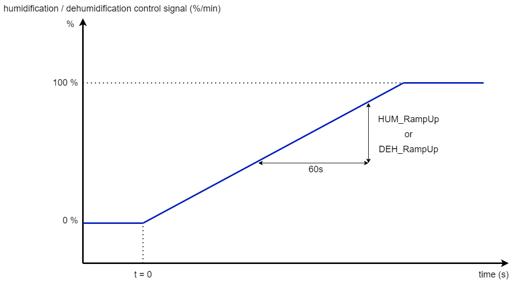 Note: To speed up the ramp functions, the respective parameters HUM_RampUp and/or DEH_RampUp can be set to the value of 100. In that case, the signal will be raised at 100% per minute and this is faster than the runtime of the actuator that is normally used.