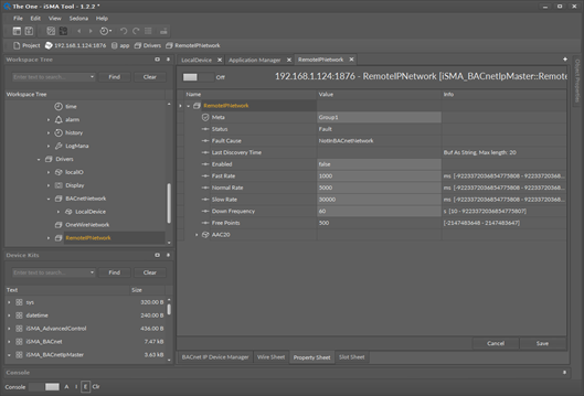 The BACnet RemoteIPNetwork is primarily used to extend the I/O of the iSMA-B-AAC20 controller by adding the devices IP module range. It can also be used to pick up the points from the 3rd party systems. The BACnet RemoteIPNetwork component must be placed under the BACnet Network component from the BACnet Network kit.