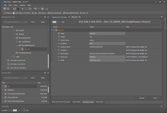 The BACnet Remote IP Network allows also to add the device manually (offline). To do this, add the BACnet Device component under the Remote IP Network, enter the BACnet Device ID number and optional IP address (slot ADDR) in format xxx.xxx.xxx.xxx.