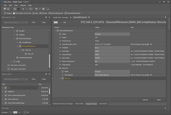 The BACnet IP master supports device discovering. This action is available under right-click on the Remote IP network component. The discovering process is shown in the Status slot. At the end of this process a Discover folder will be created and all found devices will be placed there.