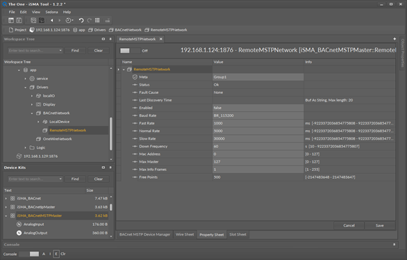 The RemoteMSTPNetwork component is the main component that provides the BACnet protocol via RS485 bus in the iSMA-B-AAC20 controller. The BACnet RemoteMSTPNetwork component must be placed under the BACnetNetwork component from the iSMA BACnet kit.