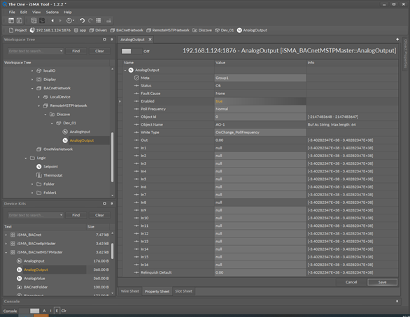 The AnalogOutput component is used to serve the Analog Output BACnet MS/TP object type from the remote devices. This component allows to read data with the defined poll frequency (defined in the network component) and write (send) data with the defined Write Type (On Change or On Change and Poll Frequency). The component has 16 prioritized input slots and one output slot.