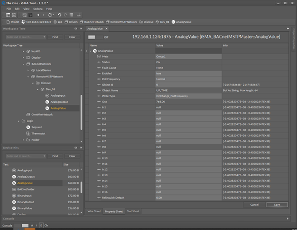 The AnalogValue component is used to serve the Analog Value BACnet MS/TP object type from the devices. This component allows to read data with the defined poll frequency (defined in the network component) and to write (send) data with the defined Write Type (On Change or On Change and Poll Frequency). The component has 16 prioritized input slots and one output slot.