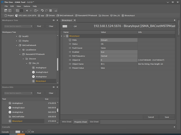 The BinaryInput component is used to read the Binary Input BACnet MS/TP object type from the remote devices. This component allows reading data with the defined poll frequency (defined in the network component).