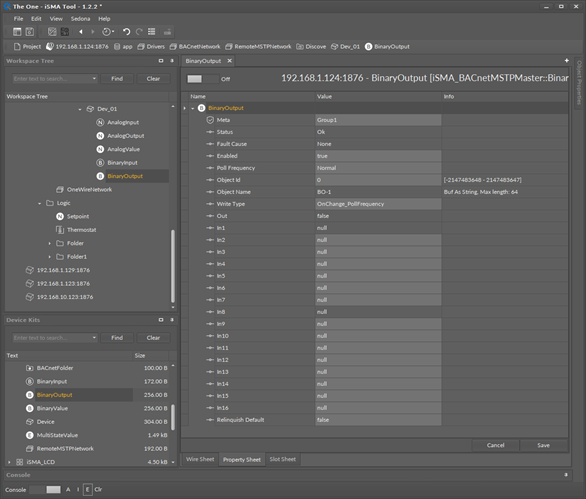 The BinaryOutput component is used to serve the Binary Output BACnet MS/TP object type from the remote devices. This component allows to read data with the defined poll frequency (defined in the network component) and to write (send) data with the defined Write Type (On Change or On Change and Poll Frequency). The component has 16 prioritized input slots and one output slot.