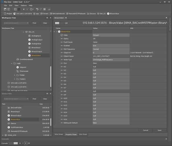 - In1: (read-only) component input slot with the highest priority, can be set by the Emergency Set action or by the BACnet MS/TP device;