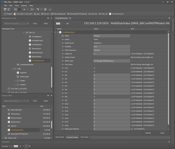The iSMA BACnet MultiStateValue is a component to serve the Multistate BACnet MS/TP objects from the remote devices. This component uses only Integer values. This component can also read the text labels assigned to numbers. It also allows to read data with the defined poll frequency (defined in the network component) and to write (send) data with defined the Write Type (On Change or On Change and Poll Frequency). The component has 16 prioritized input slots and one output slot.