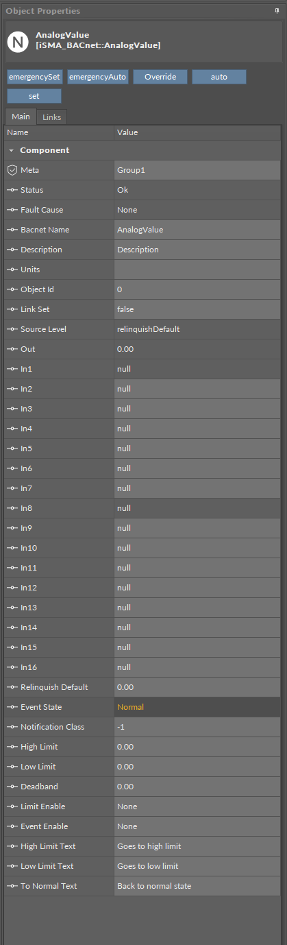 The AnalogValue component is used to share a numeric value from the iSMA-B-AAC20 controller as the AnalogValue BACnet object. This component allows to read data from the controller (Out slot) or write data (input slots from 1 to 16) to the controller within the BACnet Network. The component has 16 prioritized input slots and one output slot. The output slot gets value from the input with the highest priority different from the null value. For example, if only In16, In13, and In9 have values different from null, the output slot will retrieve the value from In9, because it has the highest priority of all inputs with the value.