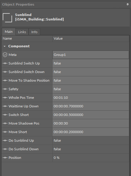 The Sunblind component has been created to allow the control of the sunblind with one function block. It best suits simple projects, where only simple up/down manual or BMS control is required. There is a dedicated slot for monitoring the current position of the sunblind.