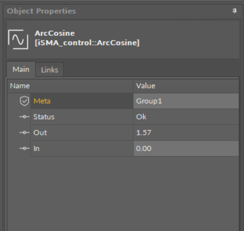 The ArcCosine component returns the arccosine value of the input (performs the operation out := acos (inA)).