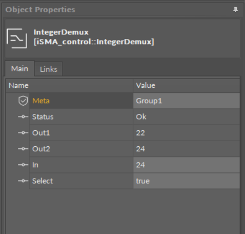 The IntegerDemux component selects one of two outputs to receive the input (integer) value, depending on the value of the selected Boolean input. The value of the other output remains unchanged.