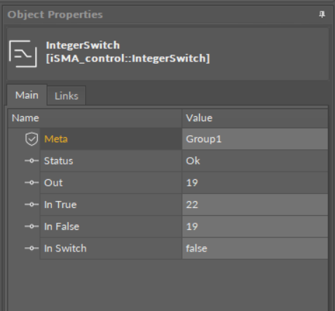 - In Switch: the value indicating, which slot transfers value to the output: true for the In True value, false for the In False value.