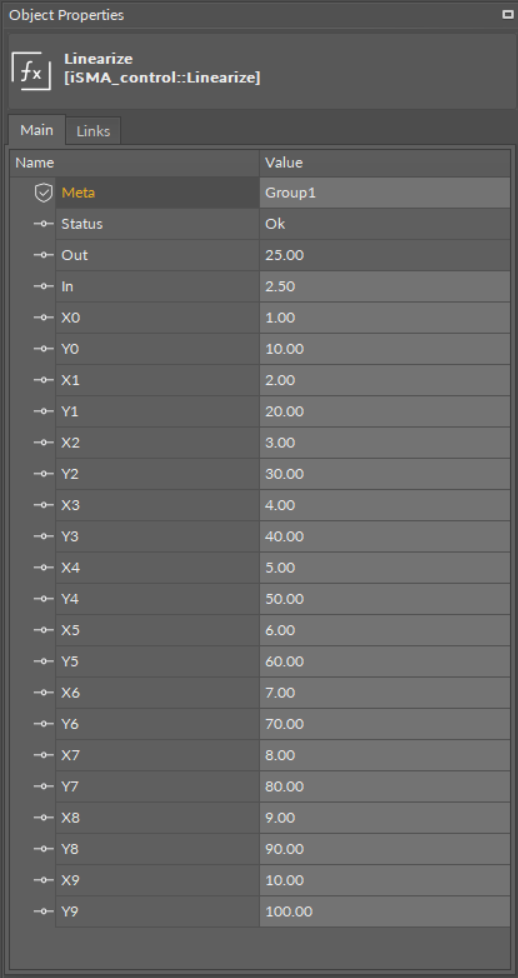 The Linearize component performs a piecewise linearization of a float and allows to scale the Out slot value depending on the set input values interval. The In slot value is compared with x intervals, and the component estimates the Out slot value based upon the linear function.