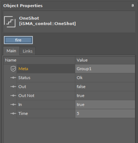 - Out: displays the current value that changes from false to true at the In property value. After the OneShot is triggered and the Time value period expires, this value returns to the default (false) value;