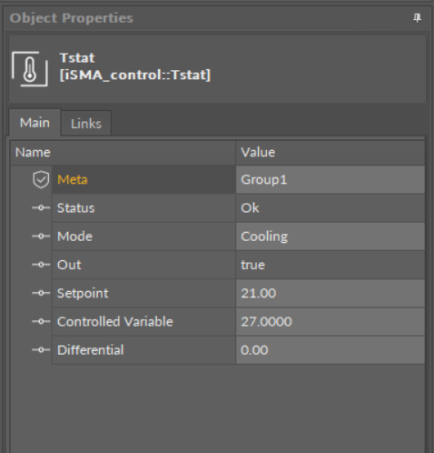 The Tstat component provides a basic thermostatic (on/off) control with the Boolean Out property and numeric inputs for controlled variable (Cv), Setpoint (Sp), and differential (Diff).