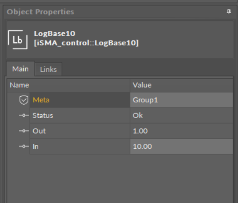 The LogBase10 component returns a common logarithm (a logarithm to the base 10) of the In value (performs the operation out := log10 (inA)).