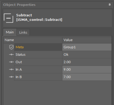 The Subtract component performs the operation out := (InA - InB). If either input is numeric.NaN, the output will be numeric.NaN.