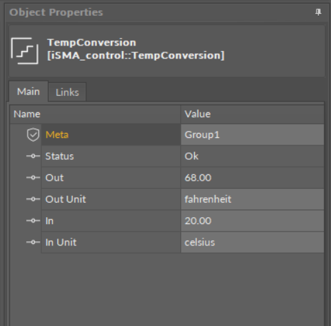 Out: the temperature expressed in units defined in the Out Unit slot;