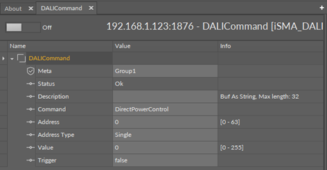 The DALICommand is used for triggering the DALI commands. Individual In slots are provided for various DALI commands. A transition from false to true will cause the associated DALI command to be sent to the control gear.