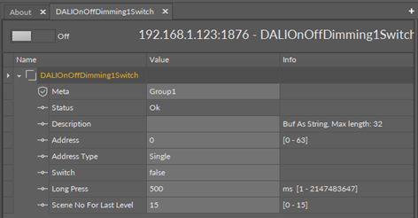 This component has a built-in DALI command, which allows to switch on and off or to change DALI device/devices lighting level. This component is designed to work with a single switch (one button connected to one digital input). The switch is working in two modes, short and long press. The short press (if the Switch slot is in the true mode for the time shorter than defined in the Long Press slot) triggers a toggle function, so each short press sends an on/off command to DALI device/devices. The long press is to increase or decrease the lighting level. Each press toggles between the increase or decrease function. Current lighting level is stored in the device in the scene number defined in the Scene No For Last Level slot (by default, scene no. 15). The short press on command invokes the lighting level stored in this scene. The component knows how to perform the next action based on the actions previously performed on it, therefore, it is not suitable to connect it with other components affecting the same ballast (whether by Address Type Single or Group, or All). Each action performed on a ballast by another component causes the action to desynchronize in the DALIOnOffDimming1Switch.