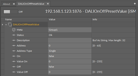 This component has the built-in DALI command, which sends a lighting level to directly to DALI device/devices. The component has defined two sending slots, so different values for on and off trigger can be defined.