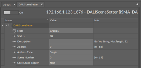 - Save Scene: sends a command to DALI device/devices to save the actual level for ballast to the scene number indicated by the Scene Number slot.