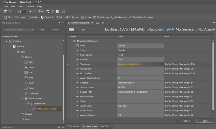 Note: In order to send out alarm notifications, the iSMA-B-AAC20 controller needs to be equipped with a memory SD card.