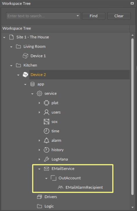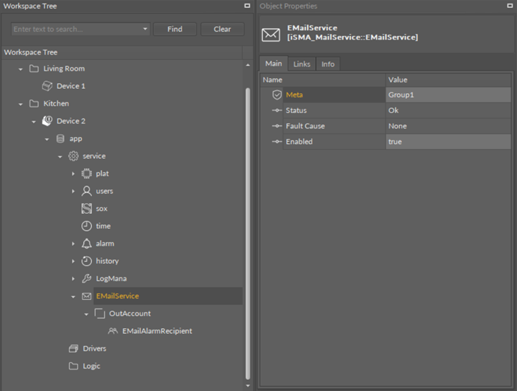 To create a new e-mail service, select the EMailService component from the Device Kits window, drag and drop it to the Workspace Tree, Device > app > service. In the Enabled slot choose true. To configure the parameters for a sending account, add an OutAccount component (by drag-and-drop from the Device Kits window) to the previously added EMailService component. To configure the recipient’s account parameters, add EMailAlarmRecipient component (by drag-and-drop from the Device Kits window) to the previously added OutAccount component. Fill in the To address slot with an e-mail address, which the messages will be sent to. Change the Enabled slot to true. To ensure proper working of the service, the controller must be connected to the internet.