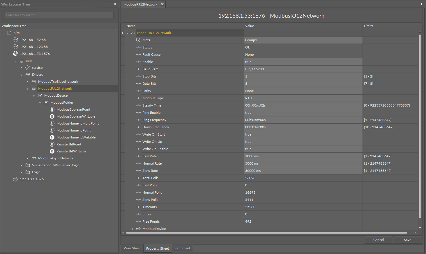 The ModbusRJ12Network is the main component, which is responsible for servicing an RJ12 physical port. The component must be placed under the Drivers folder. The ModbusRJ12Network sets parameters such as communication baud rate and data format, testing, etc., and keeps statistics.