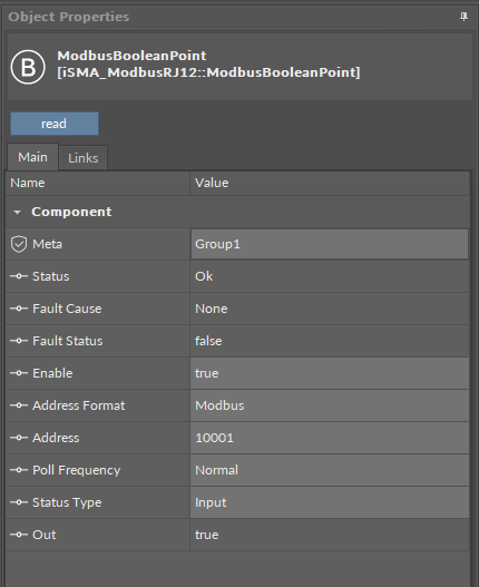 The ModbusBooleanPoint is a component, which is responsible for reading Boolean values from the device. The component has a Read action, which forces reading of the point.