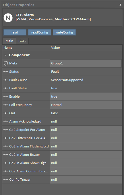 Read: reads the panel's CO2 alarm status and updates the Out slot;