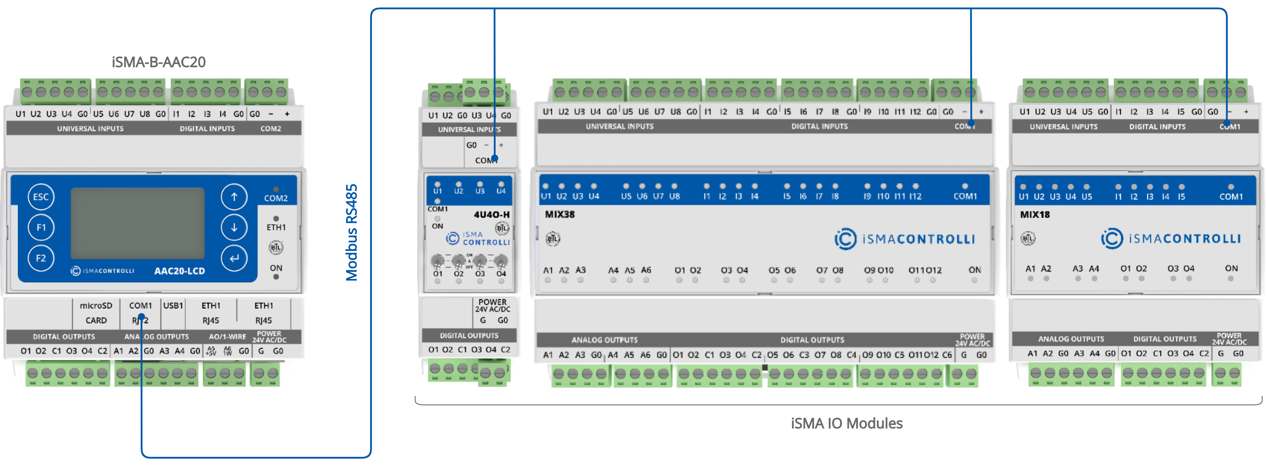 The RJ12 port connector is located between the SD card and USB slots. The connector provides Modbus bus wires, ground potential G0, and power supply directly connected to G terminal from the power supply connector (the external devices can be powered through the RJ12 connector). A wiring diagram is shown in the figure below.