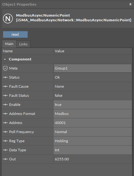 The ModbusAsyncNumericPoint is a component, which is responsible for reading numeric values from the device. The component has a Read action, which forces the reading of the point.