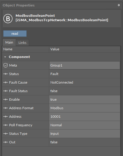 The ModbusBooleanPoint is a component, which is responsible for reading Boolean values from the device. The component has a Read action available under the right-click, which forces the reading of the point.