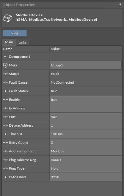 The component has a Ping action available under the right-click, which sends a test message to the device to check the device status. Each ModbusDevice has a “Ping Address” container slot with 3 properties slots (Address Format, Ping Address Reg, Ping Type). These properties specify a particular data address (either input register or holding register) to use as the device status test (meaning “Monitor” ping requests). Ping requests are generated at the network-level by the configurable network monitor (ModbusNetwork -> Ping Enabled). When enabled, a network’s monitor periodically pings (queries) this address. If any response id received from the device, including an exception response, this is considered a proof of communication, and the Modbus client device is no longer considered “down” if it had been previously marked “down”.