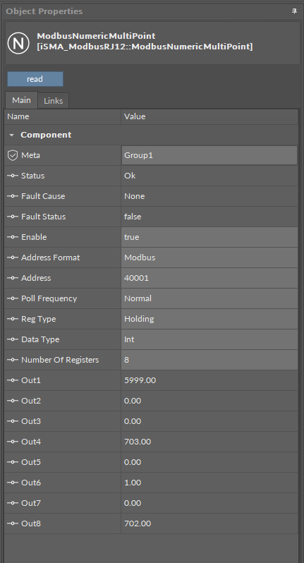 The ModbusNumericMultiPoint is a component, which is responsible for reading up to eight 16-bits registers from the device in one message. The component uses 0x03 or 0x04 Modbus commands. The component has a Read action available under the right-click, which forces the reading of the point.