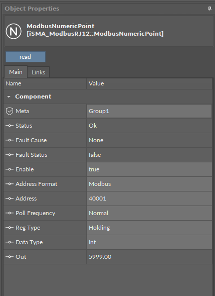 The ModbusNumericPoint is a component, which is responsible for reading numeric values from the device. The component has a Read action, which forces the reading of the point.