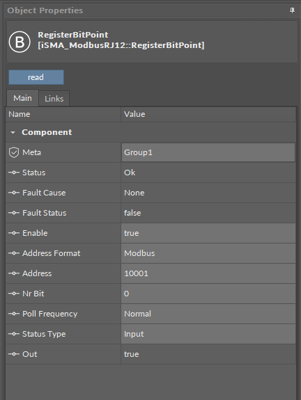The RegisterBitPoint component is responsible for reading Boolean values from a bit in a specified register in the device. The component has to be placed under the ModbusDevice component.