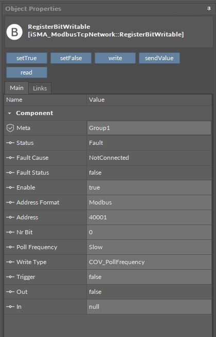The RegisterBitWritable component is responsible for sending to and reading Boolean values from a bit in a specified register in the device. The component has to be placed under the ModbusDevice component.
