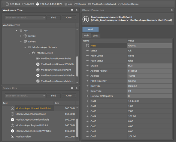 The ModbusAsyncNumericMultiPoint is a component, which is responsible for reading up to eight 16-bits registers from the device in one message. The component uses 0x03 or 0x04 Modbus commands. The component has a Read action available under the right-click, which forces the reading of the point.