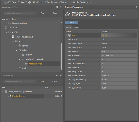 The component has a Ping action available under the right-click, which sends a test message to the device to check the device status. Each ModbusDevice has a “Ping Address” container slot with 3 properties slots (Address Format, Ping Address Reg, Ping Type). These properties specify a particular data address (either input register or holding register) to use as the device status test (meaning “Monitor” ping requests). Ping requests are generated at the network-level by the configurable network monitor (ModbusNetwork -> Ping Enabled). When enabled, a network’s monitor periodically pings (queries) this address. If any response id received from the device, including an exception response, this is considered a proof of communication, and the Modbus client device is no longer considered “down” if it had been previously marked “down”.