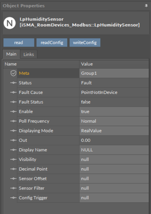 - Read Config: reads configuration parameters from the panel (Display Name, Visibility, Decimal Point, Sensor Offset, Sensor Filter);