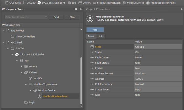 The ModbusBooleanPoint is a component, which is responsible for reading Boolean values from the device. The component has a Read action available under the right-click, which forces the reading of the point.