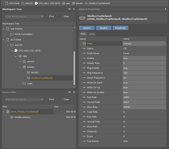 The ModbusTCPNetwork is the main component, which is responsible for servicing an IP communication to slave devices. The component must be placed under the Drivers folder. The ModbusTCPNetwork sets parameters such as communication baud rate and data format, testing, etc., and keeps statistics.