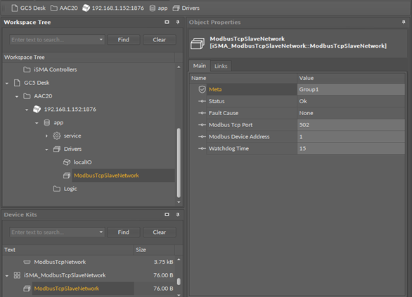 The ModbusTCPSlaveNetwork is always enabled, and it does not have to be configured in order to read the controller registers. The ModbusTCPSlaveNetwork is used only for changing parameters (parameters can be changed also from the controller’s configuration web page) and to set up user registers.