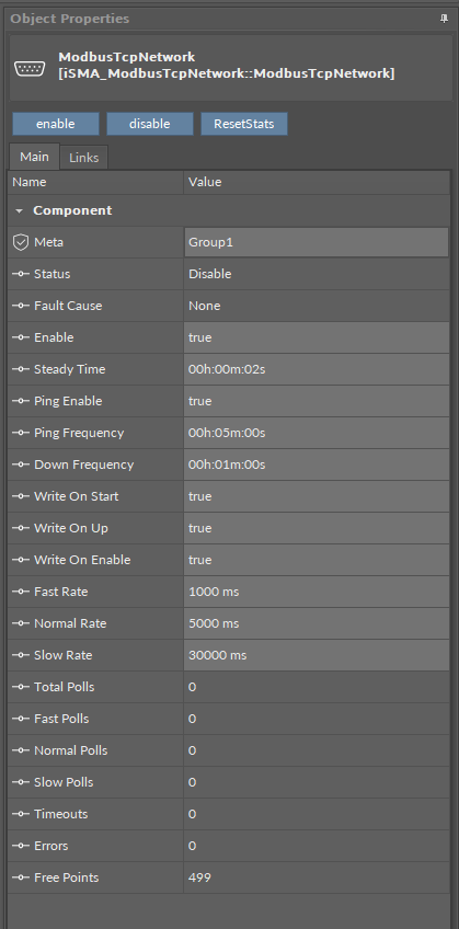 The ModbusTCPNetwork is the main component, which is responsible for servicing an IP communication to slave devices. The component must be placed under the Drivers folder. The ModbusTCPNetwork sets parameters such as communication baud rate and data format, testing, etc., and keeps statistics.