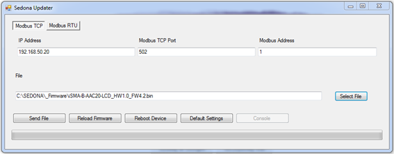 To connect to the device using the IP connection, open the SedonaUpdater.exe tool, and click the Modbus TCP button. Activity under the IP connection does not require the device to be in Bootloader mode–it is enough to enter the device’s IP address (default 192.168.1.123), Modbus TCP/IP port number (default 502), and the device’s Modbus Address (default 1).